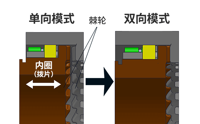 通过拨片使得棘轮结合,前进・后退均可实现轮胎反向输入到电机。